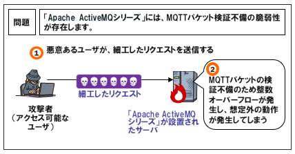 The Apache Software Foundationが提供するApache ActiveMQシリーズではMQTTパケットの検証が適切に行われておらず、整数オーバーフローが発生して想定外の動作につながる可能性があります。